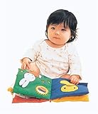 今はまだ自分でもって遊んだりということはできませんが、膝に抱っこしてこの布絵本を開くと、手を伸ばしてさわろうとします。特に、ひつじのページがお気に入りでもこもこした感触を楽しんでいるようです。また最後のページではミッフィーやクマの人形を手で引っ張って遊んでいます。